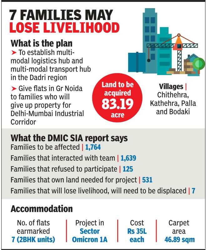 GREATER NOIDA: The families who will be forced to give up their properties to make way for the Delhi-Mumbai Industrial Corridor (DMIC) will all be given flats in Greater Noida. To establish a multi-modal logistics and transport hub in the Dadri region, the district administration needs to acquire nearly 84 hectares of land in four villages — Chithehra, Kathehra, Palla and Bodaki.