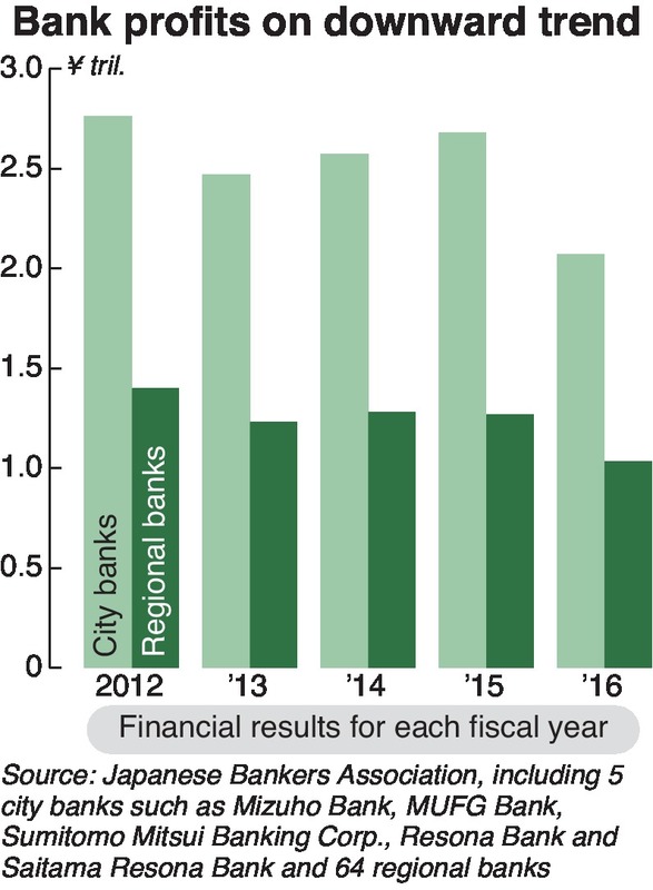 The core business of banks is collecting savings from customers, on which they pay interest, and then earning income by loaning these funds at higher interest rates. However, it has become difficult for banks to earn money this way. Profits accruing from core activities have fallen more than 20 percent for both mega banks and regional banks over the last five years.