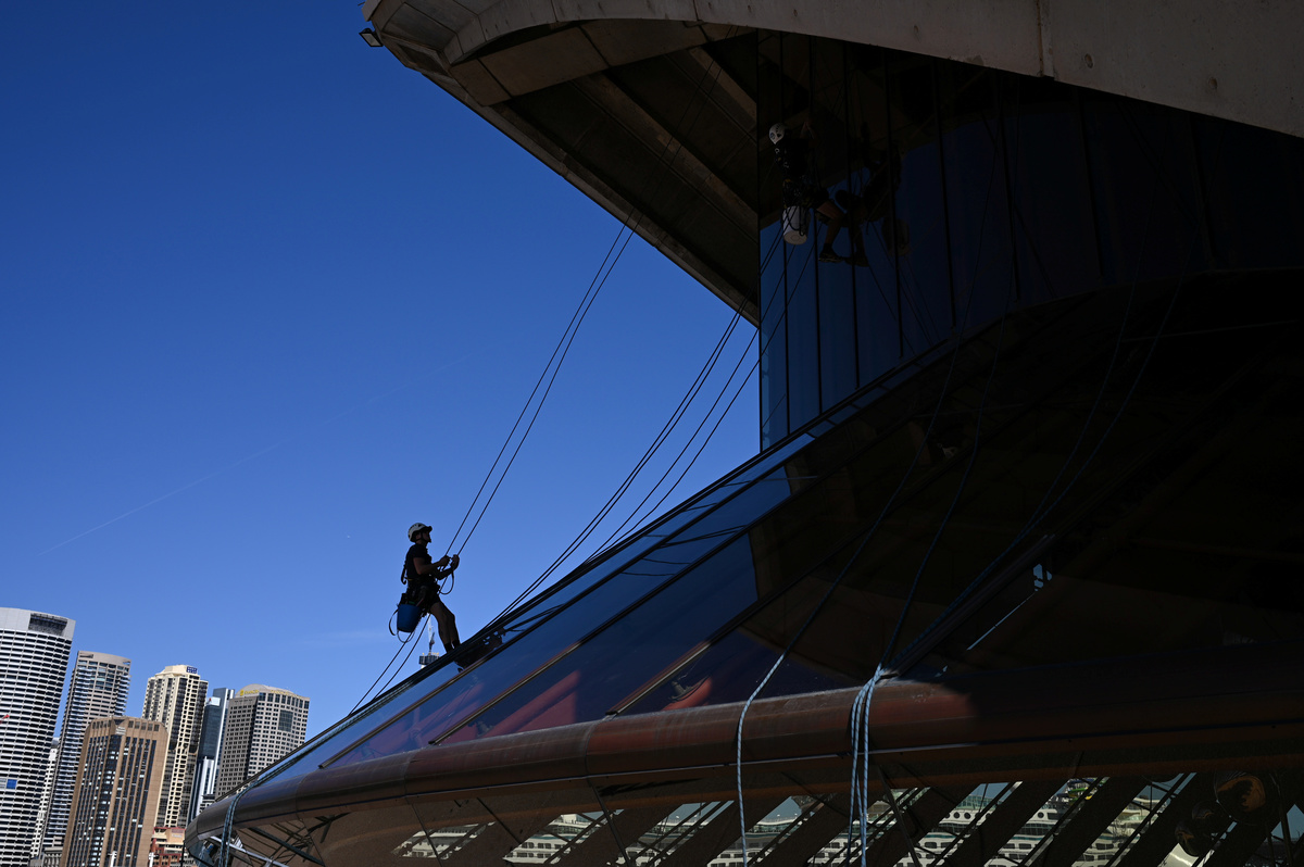 Workers clean windows on the Sydney Opera House, where scheduled public performances have been cancelled due to the coronavirus disease (COVID-19), in Sydney, Australia, March 18, 2020. REUTERS/Loren Elliott