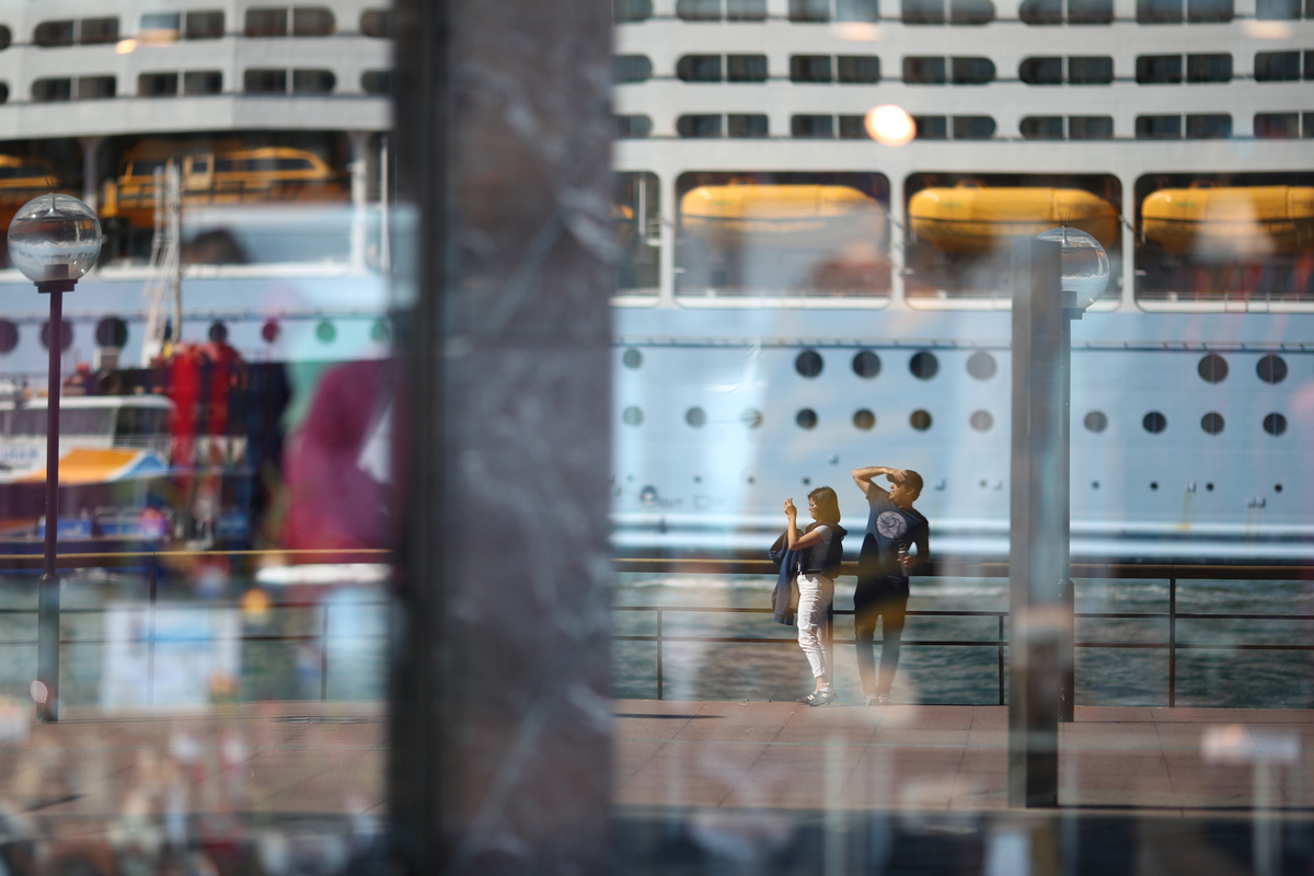 Two people, seen in the reflection of a shop window, stand on the mostly deserted waterfront of the Sydney Opera House, where scheduled public performances have been cancelled due to the coronavirus disease (COVID-19), in Sydney, Australia, March 18, 2020. REUTERS/Loren Elliott