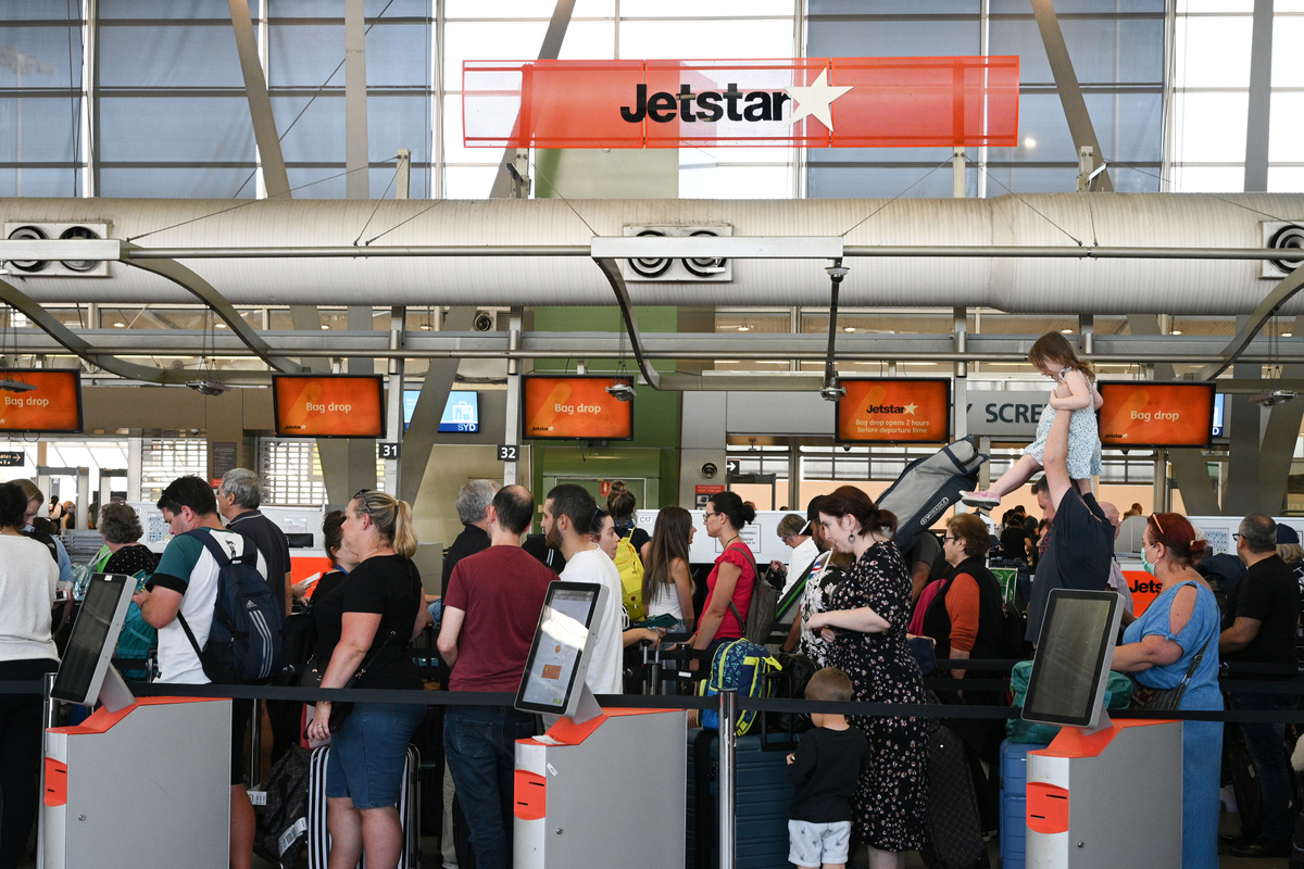 Travelers wait in line at a Jetstar Airways counter at Kingsford Smith International Airport, following the coronavirus outbreak, in Sydney, Australia, March 18, 2020. REUTERS/Loren Elliott
