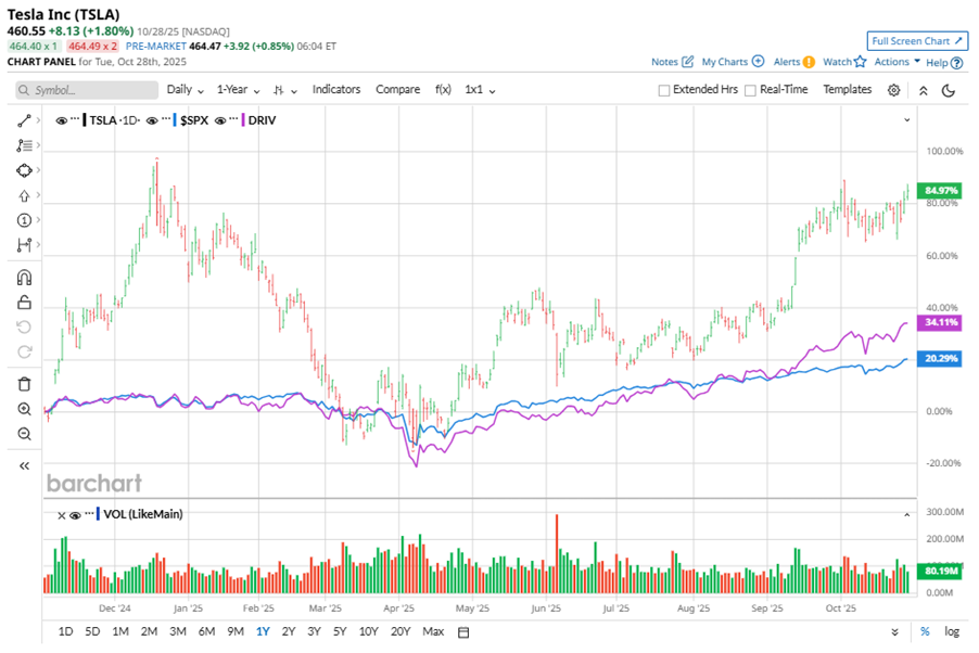 Zooming in further, TSLA’s outperformance is also apparent compared to the Global X Autonomous & Electric Vehicles ETF (DRIV). The exchange-traded fund has gained about 29% over the past year. However, the ETF’s 32% gains on a YTD basis outshine the stock’s returns over the same time frame.