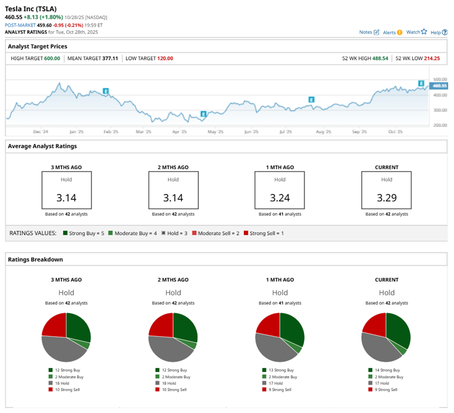 Among the 42 analysts covering TSLA stock, the consensus is a “Hold.” That’s based on 14 “Strong Buy” ratings, two “Moderate Buys,” 17 “Holds,” and nine “Strong Sells.”