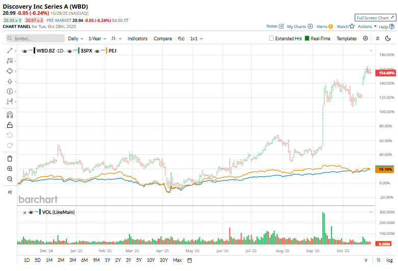 Even when compared with industry peers, WBD stands out. While the Invesco Leisure and Entertainment ETF (PEJ) gained about 19.3% over the past year and 13% in 2025, it still trails WBD’s explosive rally.