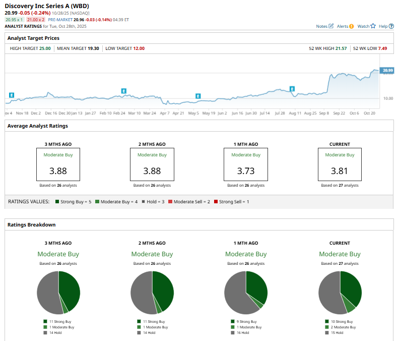 Among the 27 analysts covering WBD stock, the consensus is a “Moderate Buy.” That’s based on 10 “Strong Buy” ratings, two “Moderate Buy,” and 15 “Holds.”
