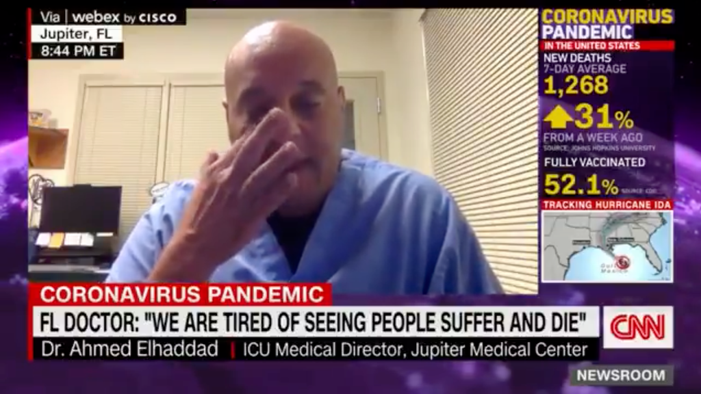 “It is very difficult,” Dr Ahmed Elhaddad, ICU Medical Director at Jupiter Medical Center told CNN on Sunday, becoming choked up as he recounted his experiences. “It’s even harder when it’s your friends. I have a patient now that’s the father of one of my son’s classmates. And he’s not expected to make it. He was not vaccinated.”