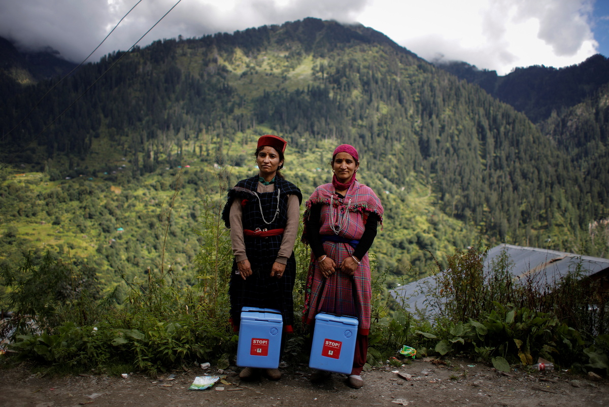 Nirma Devi, 31, and Phula Devi, 30, hold boxes containing COVISHIELD vaccines as they pose for a picture at Malana village in Kullu district in the Himalayan state of Himachal Pradesh, India, September 14, 2021. Despite the hostile terrain, the northern state of Himachal Pradesh became the first in India to administer at least one COVID-19 vaccine dose in all its adults. The steep topography was a challenge overcome by health workers walking for hours or days to reach remote villages. REUTERS/Adnan Abidi