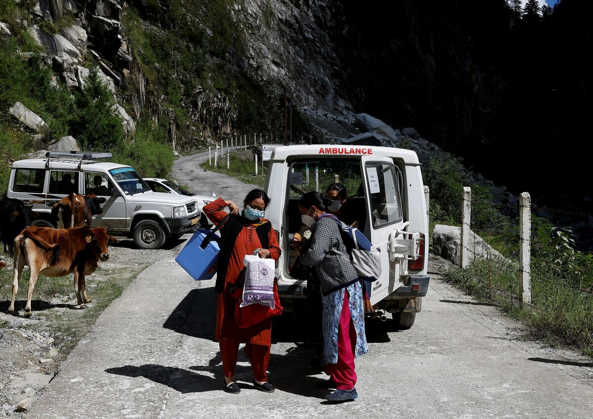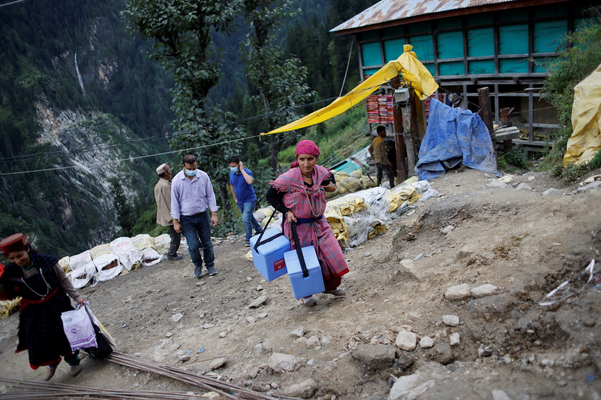 Health workers Kamla Devi, 58, and Kanta Devi, 26, trek through the mountains to vaccinate people in remote villages during a vaccination drive against the coronavirus disease (COVID-19) outbreak, near Malana village in Kullu district in the Himalayan state of Himachal Pradesh, India, September 14, 2021. Despite the hostile terrain, the northern state of Himachal Pradesh became the first in India to administer at least one COVID-19 vaccine dose in all its adults. The steep topography was a challenge overcome by health workers walking for hours or days to reach remote villages. REUTERS/Adnan Abidi Health workers trek through mountains to vaccinate people in remote villages, as a part of a vaccination drive, during the coronavirus disease (COVID-19) outbreak, near Malana village in Kullu district in the Himalayan state of Himachal Pradesh, India, September 14, 2021. Despite the hostile terrain, the northern state of Himachal Pradesh became the first in India to administer at least one COVID-19 vaccine dose in all its adults. The steep topography was a challenge overcome by health workers walking for hours or days to reach remote villages. REUTERS/Adnan Abidi Houses stand in Malana village in Kullu district in the Himalayan state of Himachal Pradesh, India, September 14, 2021. Despite the hostile terrain, the northern state of Himachal Pradesh became the first in India to administer at least one COVID-19 vaccine dose in all its adults. The steep topography was a challenge overcome by health workers walking for hours or days to reach remote villages. REUTERS/Adnan Abidi Health workers carry medical kits and a box containing COVISHIELD vaccines, before starting their trek through the mountains to vaccinate people in remote villages, as a part of a vaccination drive, during the coronavirus disease (COVID-19) outbreak, near Malana village in Kullu district in the Himalayan state of Himachal Pradesh, India, September 14, 2021. Despite the hostile terrain, the northern state of Himachal Pradesh became the first in India to administer at least one COVID-19 vaccine dose in all its adults. The steep topography was a challenge overcome by health workers walking for hours or days to reach remote villages. REUTERS/Adnan Abidi A girl sits outside a temple at Malana village in Kullu district in the Himalayan state of Himachal Pradesh, India, September 14, 2021. Despite the hostile terrain, the northern state of Himachal Pradesh became the first in India to administer at least one COVID-19 vaccine dose in all its adults. REUTERS/Adnan Abidi Kamla Devi, 58, a health worker, gives a dose of the COVISHIELD vaccine to a villager, as part of a vaccination drive during the coronavirus disease (COVID-19) outbreak, at Malana village in Kullu district in the Himalayan state of Himachal Pradesh, India, September 14, 2021. "People were initially scared to take the vaccine, worried they would fall sick or die" said village head Rajuram. "Then I took it and others also mustered the courage." REUTERS/Adnan Abidi Medical kits and boxes containing COVISHIELD vaccines, are transported on a ropeway trolley to Malana village, during the coronavirus disease (COVID-19) outbreak, in Kullu district in the Himalayan state of Himachal Pradesh, India, September 14, 2021. Before beginning the trek to the village, health workers placed vaccine boxes onto a gondola connected to pulleys to carry the medicine across the river gorge that separates Malana from the road. REUTERS/Adnan Abidi Health workers eat their lunch as they take a break during a trek through the mountains to vaccinate people in a remote villages as a part of a vaccination drive, during the coronavirus disease (COVID-19) outbreak, near Malana village in Kullu district in the Himalayan state of Himachal Pradesh, India, September 14, 2021. Despite the hostile terrain, the northern state of Himachal Pradesh became the first in India to administer at least one COVID-19 vaccine dose in all its adults. The steep topography was a challenge overcome by health workers walking for hours or days to reach remote villages. REUTERS/Adnan Abidi Kamla Devi, 58, a health worker, gives a dose of the COVISHIELD vaccine, as a part of a vaccination drive during the coronavirus disease (COVID-19) outbreak, at Malana village in Kullu district in the Himalayan state of Himachal Pradesh, India, September 14, 2021. "People were initially scared to take the vaccine, worried they would fall sick or die" said village head Rajuram. "Then I took it and others also mustered the courage." REUTERS/Adnan Abidi People sit outside a temple at Malana village in Kullu district in the Himalayan state of Himachal Pradesh, India, September 14, 2021. "People were initially scared to take the vaccine, worried they would fall sick or die" said village head Rajuram. "Then I took it and others also mustered the courage." REUTERS/Adnan Abidi Kanta Devi, 26, a health worker, carries a box containing COVISHIELD vaccines, as she walks through a road that was blocked after a landslide, during the coronavirus disease (COVID-19) outbreak, near Malana village in Kullu district in the Himalayan state of Himachal Pradesh, India, September 14, 2021. Blocked by the landslide, they left their vehicle with two blue vaccine boxes slung over their shoulders to manoeuvre over the rubble, climb the wall and then walk to the trailhead leading to the village. Despite the hostile terrain, the northern state of Himachal Pradesh became the first in India to administer at least one COVID-19 vaccine dose in all its adults. REUTERS/Adnan Abidi Health workers walk through a road, that was blocked after a landslide, as they trek to a remote villages as a part of a vaccination drive, during the coronavirus disease (COVID-19) outbreak, near Malana village in Kullu district in the Himalayan state of Himachal Pradesh, India, September 14, 2021. Blocked by the landslide, they left their vehicle with two blue vaccine boxes slung over their shoulde