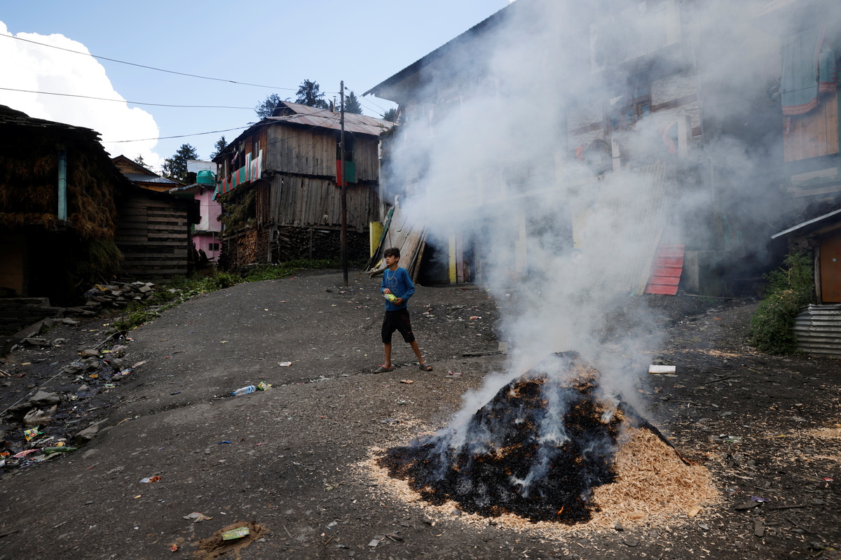 Villagers stand next to a fire outside their house at Malana village in Kullu district in the Himalayan state of Himachal Pradesh, India, September 14, 2021. Despite the hostile terrain, the northern state of Himachal Pradesh became the first in India to administer at least one COVID-19 vaccine dose in all its adults. REUTERS/Adnan Abidi