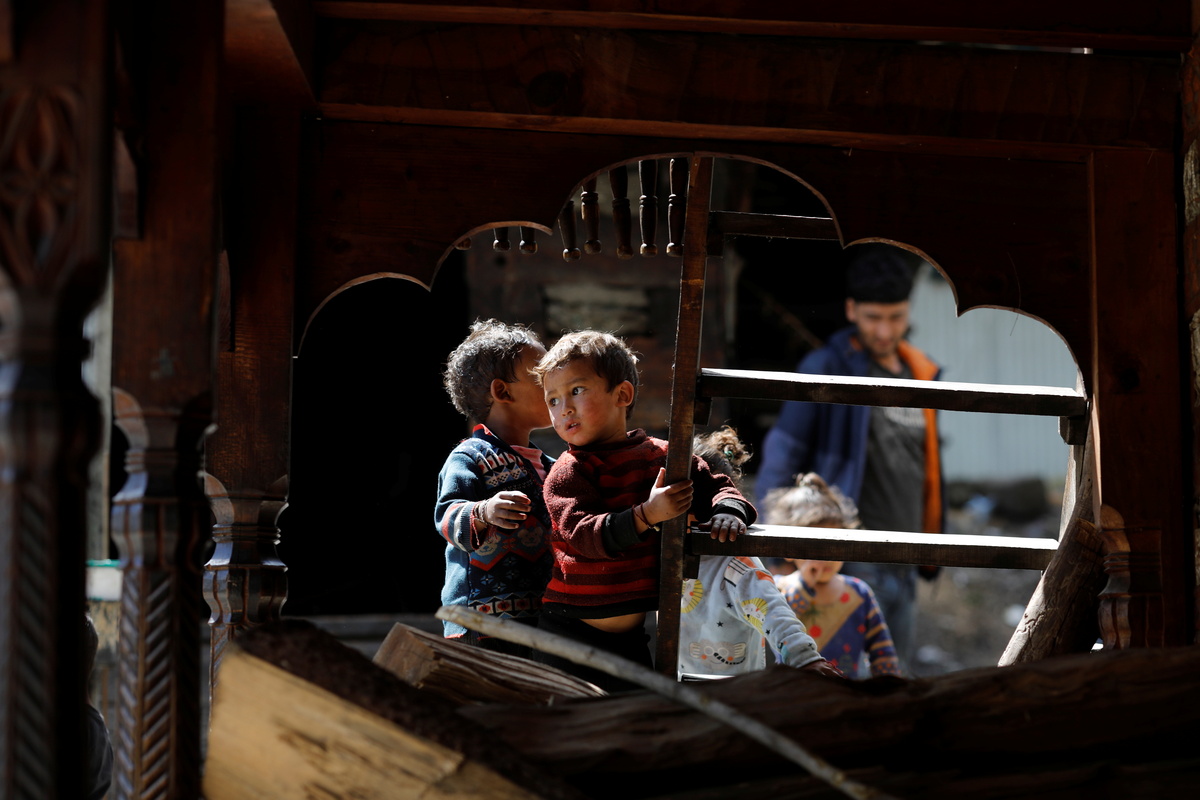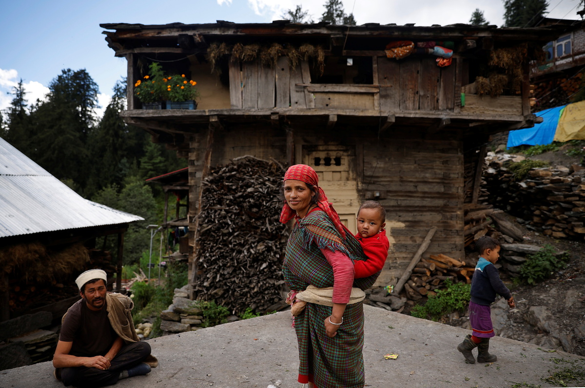 A family stands outside their house at Malana village in Kullu district in the Himalayan state of Himachal Pradesh, India, September 14, 2021. Despite the hostile terrain, the northern state of Himachal Pradesh became the first in India to administer at least one COVID-19 vaccine dose in all its adults. REUTERS/Adnan Abidi