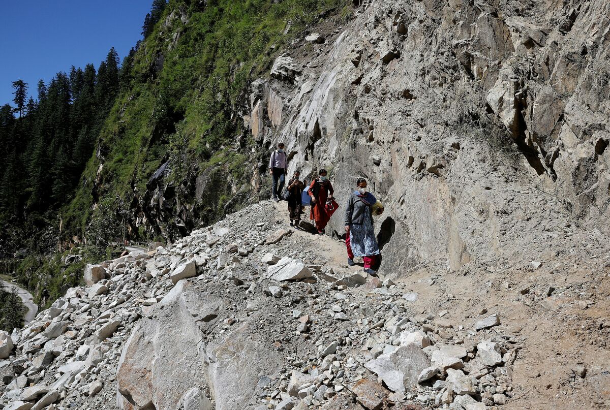 Blocked by the landslide, they left their vehicle with two blue vaccine boxes slung over their shoulders to manoeuvre over the rubble, climb the wall and then walk to the trailhead leading to the village, accompanied by a Reuters photographer.