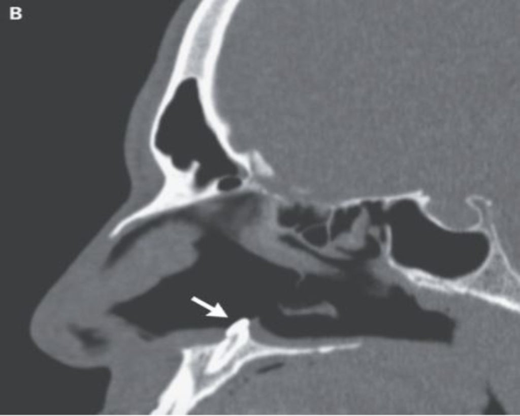 A computed tomography (CT) scan of the paranasal sinuses – or air-filled spaces that surround the nasal cavity – showed a “well-defined, radiodense mass consistent with an inverted ectopic tooth” in the right nasal cavity.
