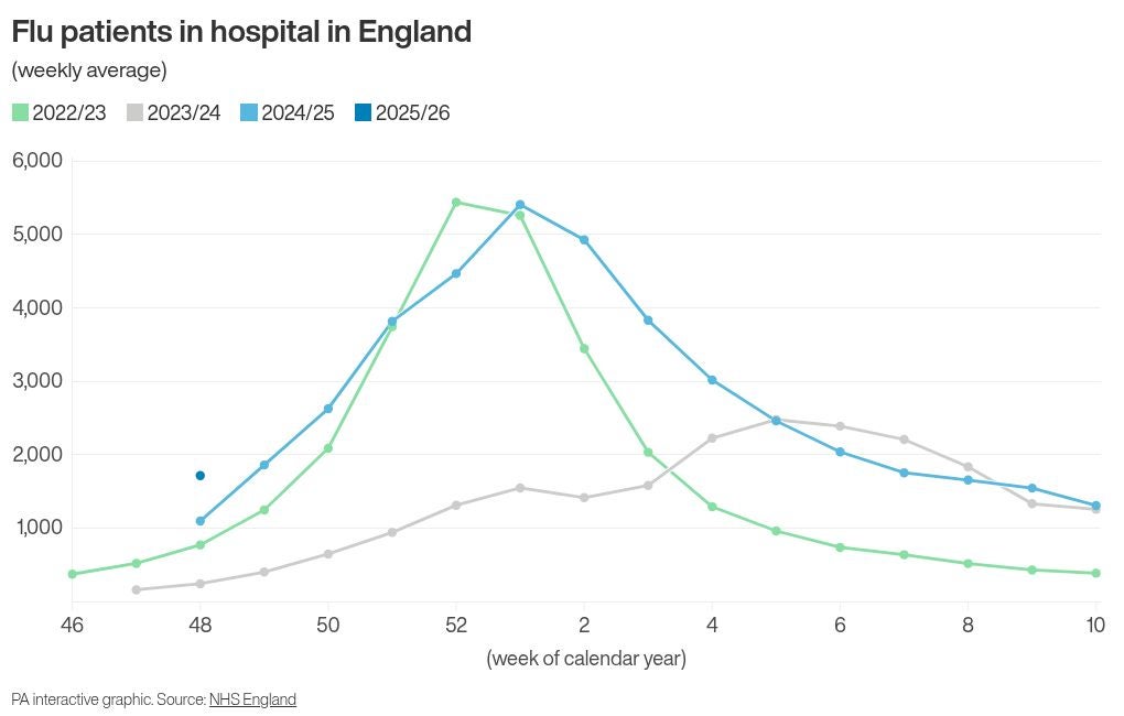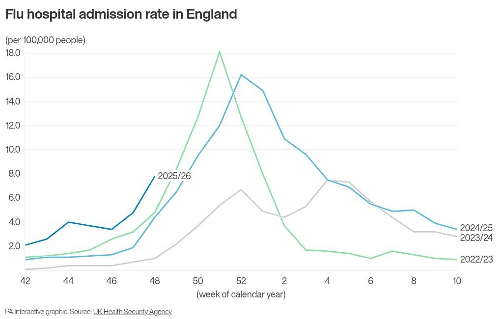 It comes as the number of people in hospital with flu in England is at a record level for this time of year.