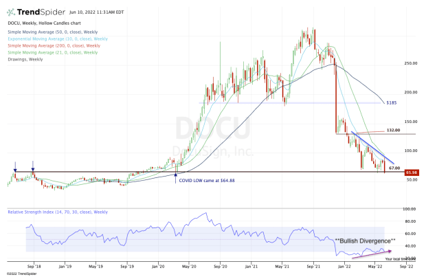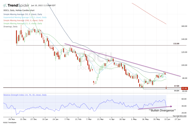 Docusign stock narrowly undercut the May low at $64.84 before bouncing. If it can hold up above $64, then bulls might be able to muster up a bounce out of this one.