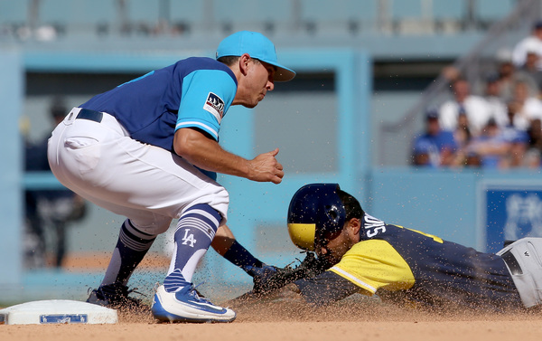 In five innings, Darvish threw 95 pitches, struck out seven and walked three. It was his third start in four appearances as a Dodger that did not live up to his expectations. To begin, he walked Eric Sogard, and set down Hernan Perez on strikes. After Neil Walker blooped a single into left, Travis Shaw tapped a ball to shortstop, where Corey Seager reacted late to let it travel between his legs for an error.