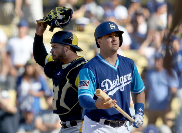 The Dodgers put two men on in the ninth for pinch-hitter Kyle Farmer, he of the walk-off hit in his major league debut last month. He battled to eight pitches against Milwaukee closer Corey Knebel, but struck out swinging on a 98-mph fastball to end it.