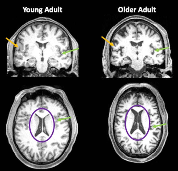 When it comes to brain structure, we typically see a decrease in the size of the brain in adults over age 65. This decrease is not just localized to one area. Differences can be seen across many regions of the brain. There is also typically an increase in cerebrospinal fluid that fills space due to the loss of brain tissue. In addition, white matter, the insulation on axons — long cables that carry electrical impulses between nerve cells — is also less intact in older adults.