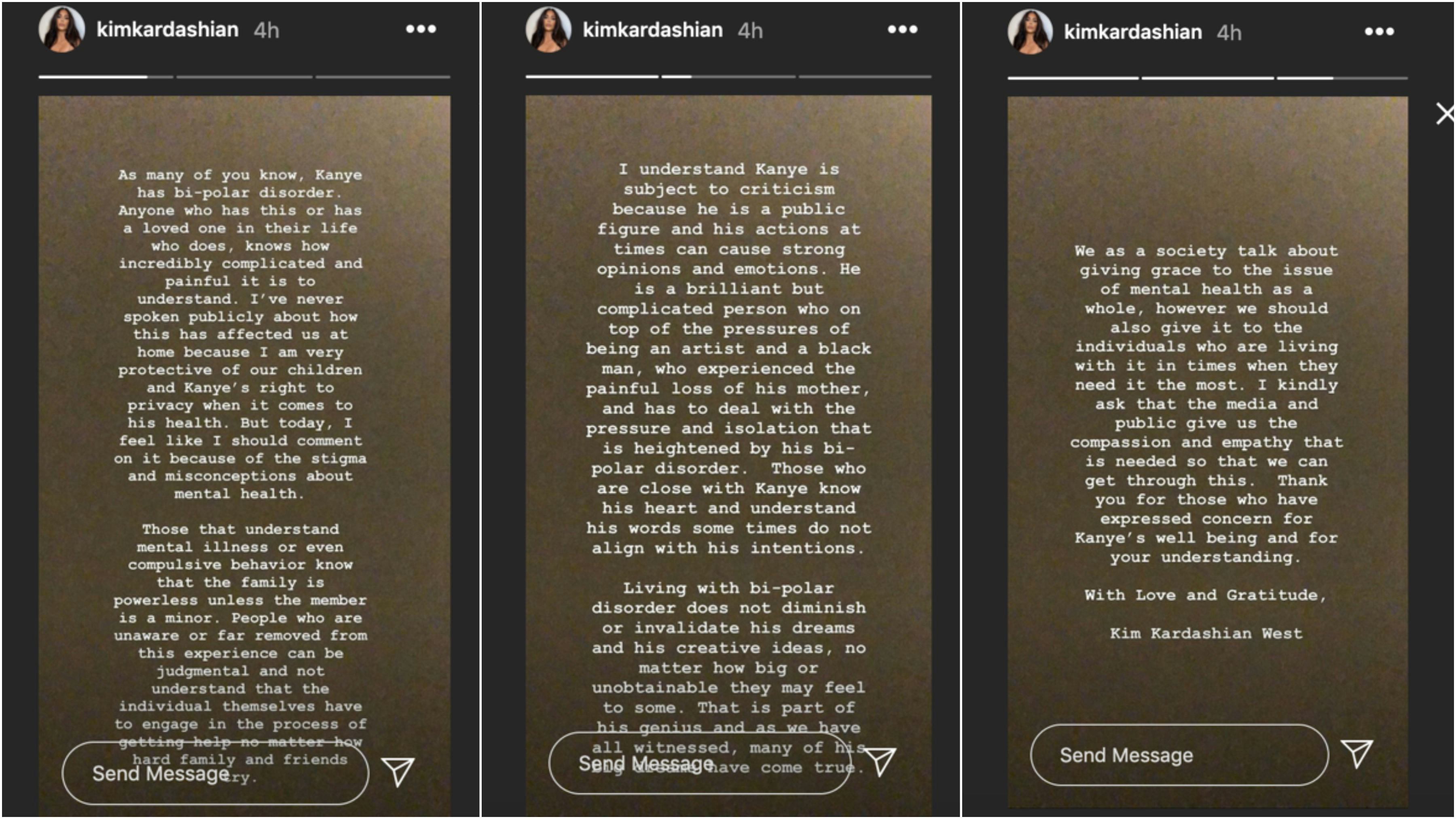 On Wednesday, Kardashian West broke her silence on her husband’s most recent round of headline-grabbing comments, asking the public to show “compassion and empathy” towards her husband. “As many of you know, Kanye has bi-polar disorder,” Kardashian West wrote. “Anyone who has this or has a loved one in their life who does, knows how incredibly complicated and painful it is to understand. I’ve never spoken publicly about how this has affected us at home because I am very protective of our children and Kanye’s right to privacy when it comes to his health.”