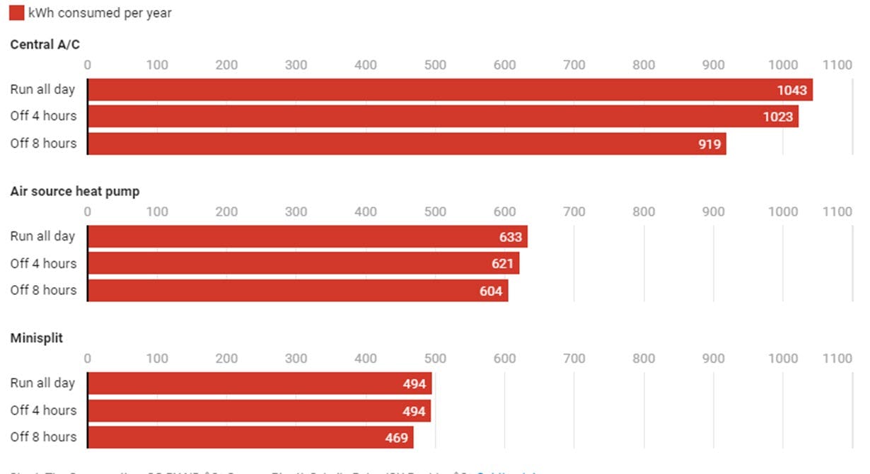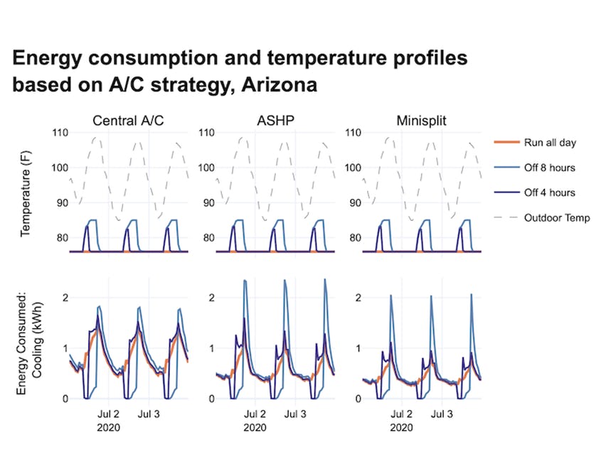 For three kinds of cooling systems — central air conditioning, air source heat pump, and mini-split — it was most efficient to turn cooling off during the eight-hour workday and then on again at the end of the day. This simulation took into account Arizona's hot but dry weather.