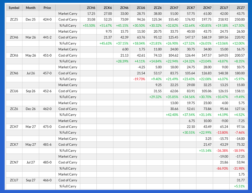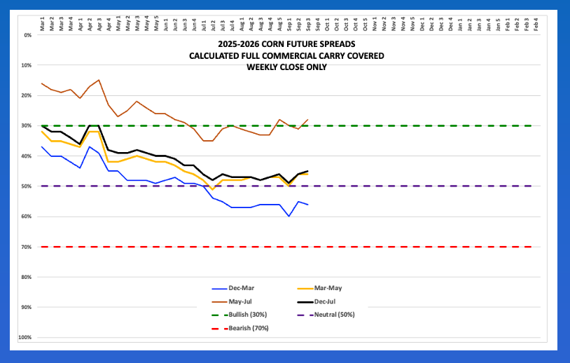 - The 2025-2026 marketing year Dec-July forward curve closed at a carry of 33.0 cents and covered 45% calculated full commercial carry as compared to the previous week’s 46%. Again, this does not indicate the commercial side sees the expected decrease in demand for US corn creating a significant change in the market’s fundamentals over the coming year.