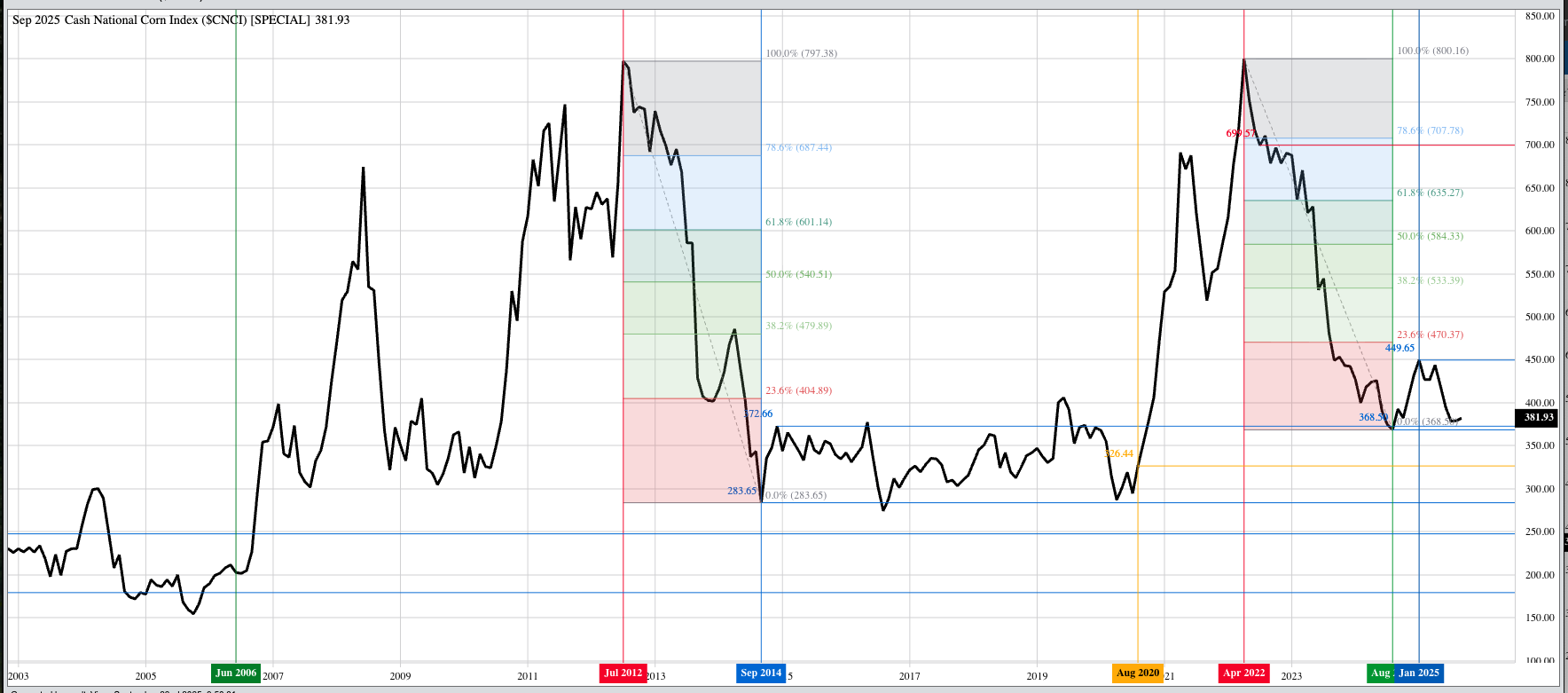 - If using a Dec-only fund to invest in the market, the long-term December (ZCZ25) continuous monthly chart continues to show an uptrend that began at the end of August 2024 with another technical buy signal completed at the end of August 2025.
