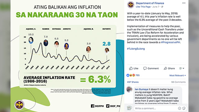 The DOF's Facebook post stated that inflation in the country stood at 6.3% on average over the past 3 decades, and 4.1% year-to-date. (READ: Philippine inflation spikes at 4.6% in May 2018)