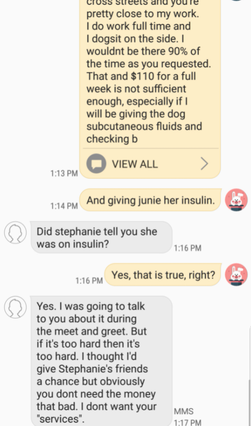 Curious to know why, Claudia replies asking what made her turn down the job to which the dog sitter says she “wouldn’t be there 90 per cent of the time as requested” and that $110 per week “wasn’t sufficient enough” especially she would be responsible for giving the Junie certain fluids and checking the dog’s blood sugar levels.