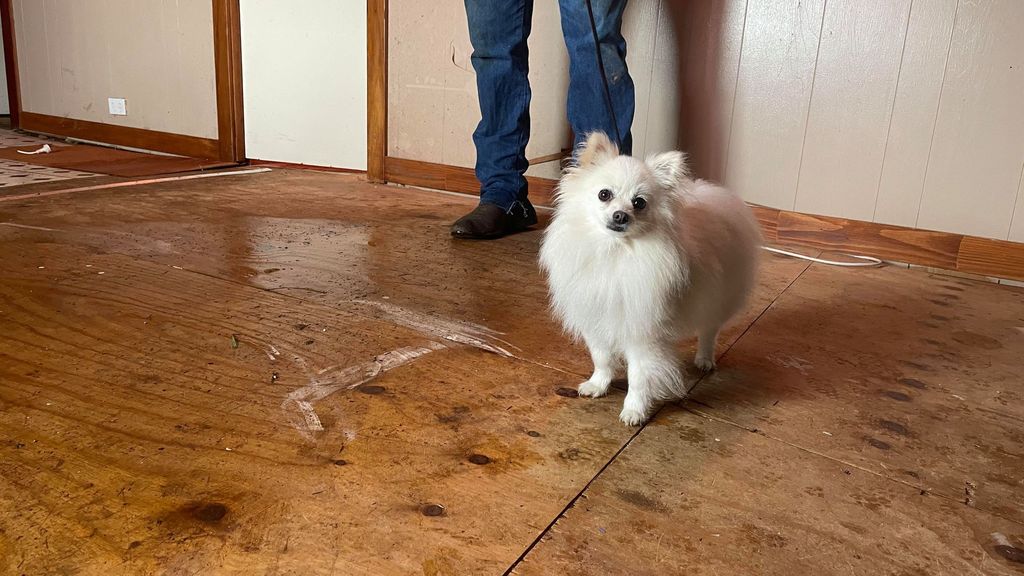 Pom Pom the Pomeranian weighs 1.5 kilograms and her owners say she stood little chance of staying on the ground in the storm, which ripped off roofs and demolished houses.