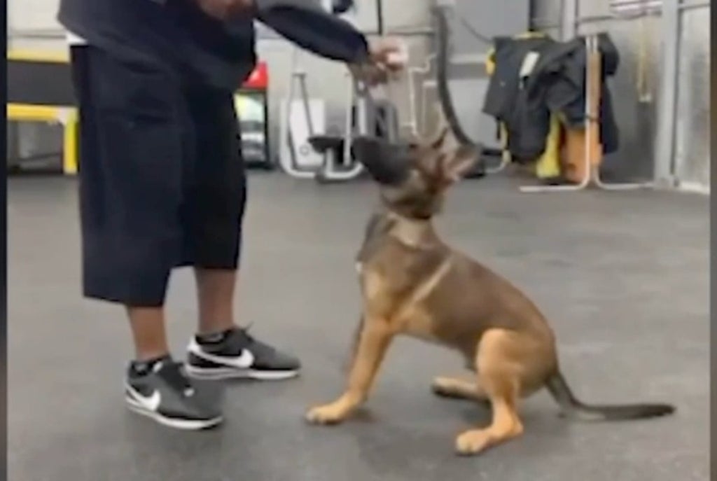 In the video, which has been widely circulated on social media, the trainer picks the German Shepherd dog up by its leash before swinging it over his shoulder and pounding it to the ground.