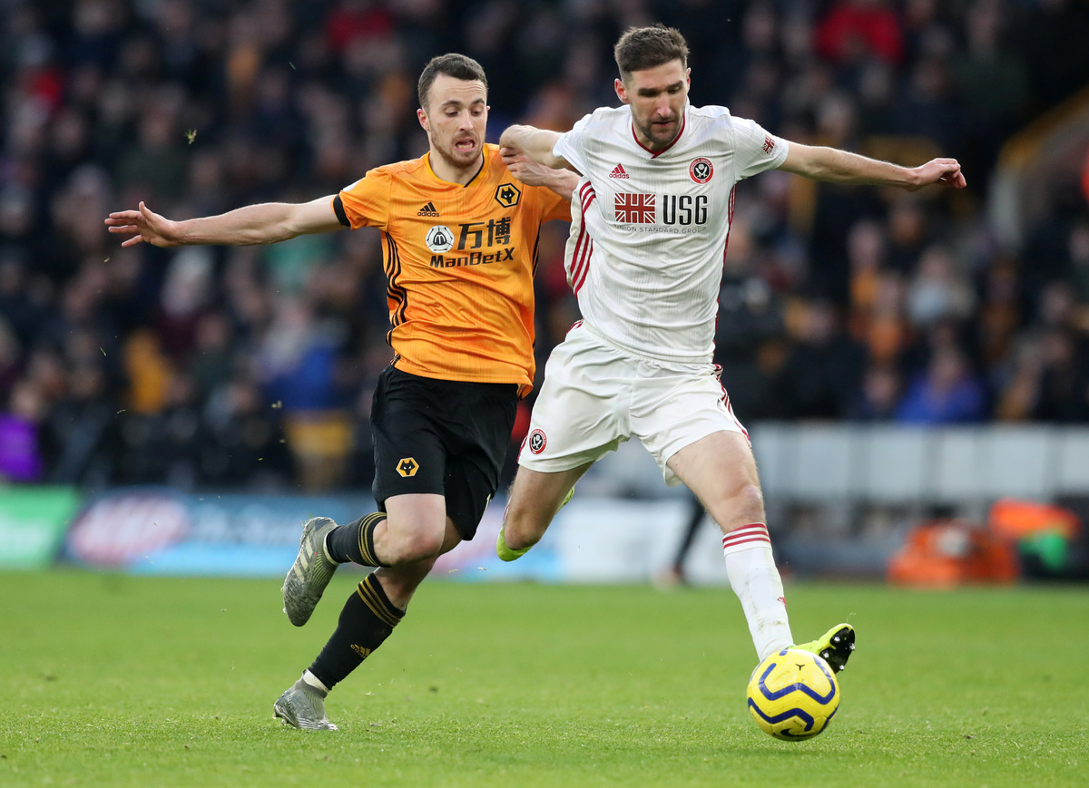 Soccer Football - Premier League - Wolverhampton Wanderers v Sheffield United - Molineux Stadium, Wolverhampton, Britain - December 1, 2019 Sheffield United's Chris Basham in action with Wolverhampton Wanderers' Diogo Jota REUTERS/Jon Super