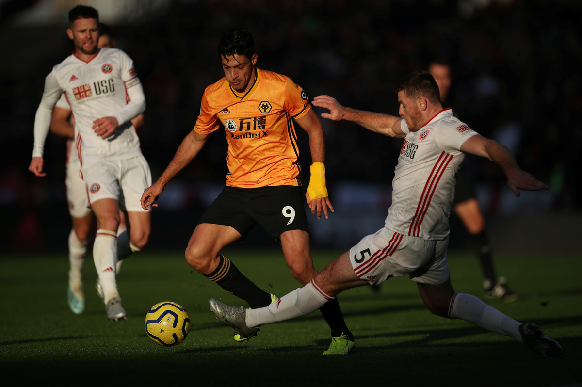Soccer Football - Premier League - Wolverhampton Wanderers v Sheffield United - Molineux Stadium, Wolverhampton, Britain - December 1, 2019 Wolverhampton Wanderers' Raul Jimenez in action with Sheffield United's Jack O'Connell Action Images via Reuters/Carl Recine