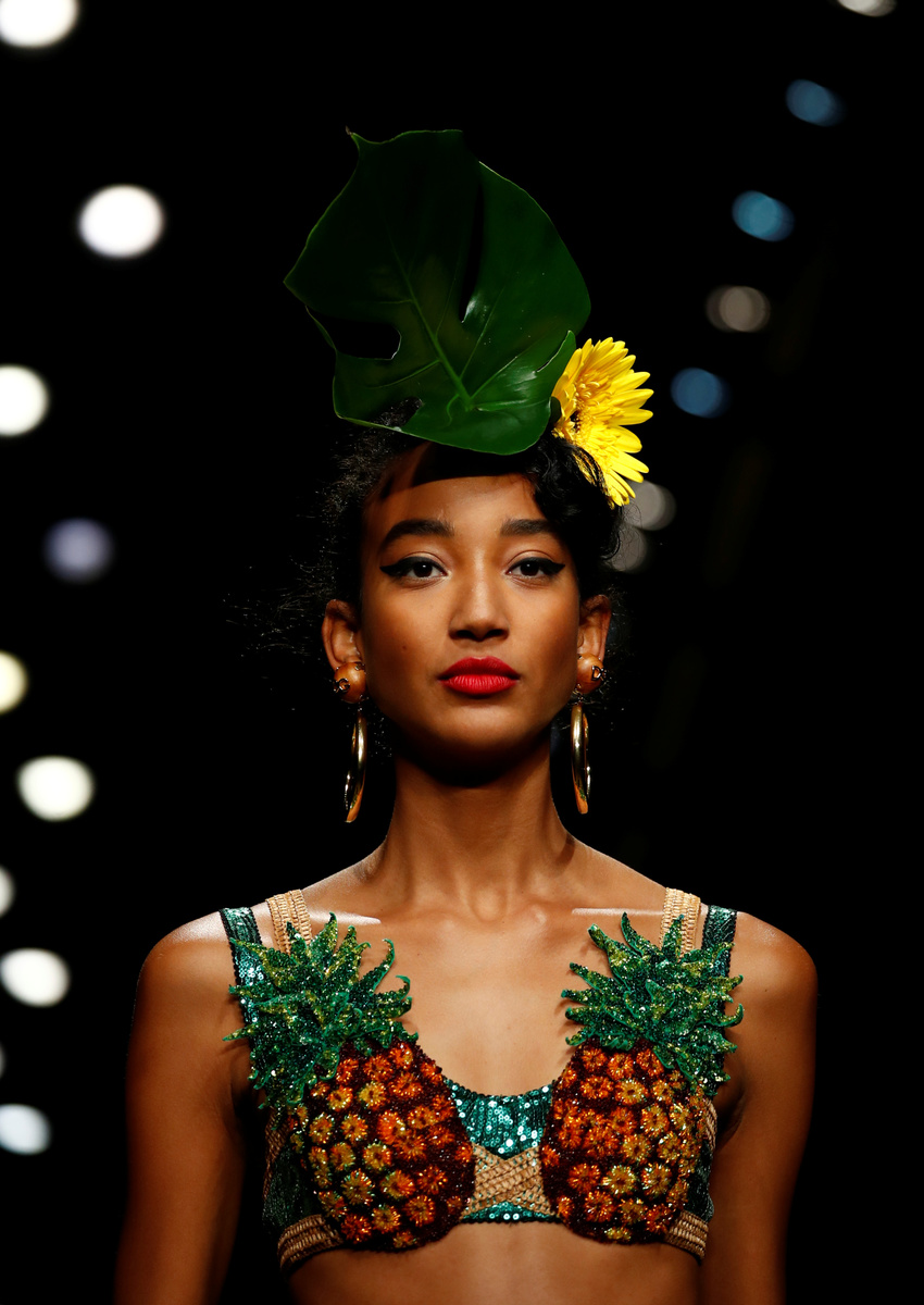 Models wore tropical flowers or knotted scarves in their hair while footwear came in all types, sometimes with animal prints. Some sandals had leaf straps. Sunglasses were doubled - one pair quirkily sitting on top of another.