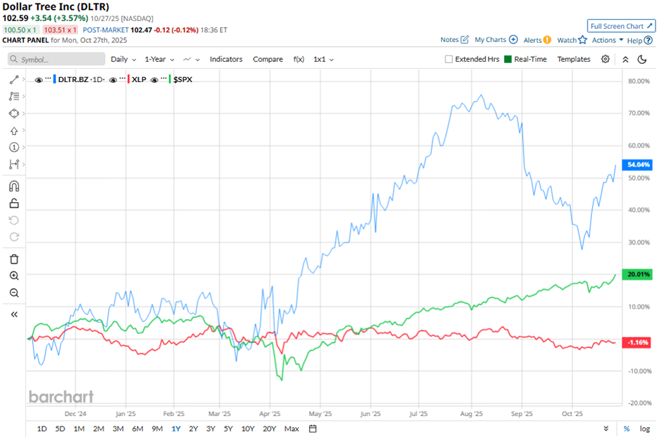 Shares of DLTR have climbed 54.4% over the past 52 weeks, exceeding both the S&P 500 Index's ($SPX) 18.4% gain and the Consumer Staples Select Sector SPDR Fund’s (XLP) 2.3% decline over the same period.