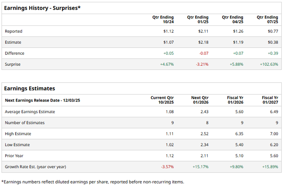 The Chesapeake, Virginia-based company is expected to announce its fiscal Q3 2025 results soon. Ahead of this event, analysts expect the company to report an adjusted EPS of $1.08, down 3.6% from $1.12 in the year-ago quarter. It has surpassed Wall Street's earnings estimates in three of the last four quarters while missing on another occasion.
