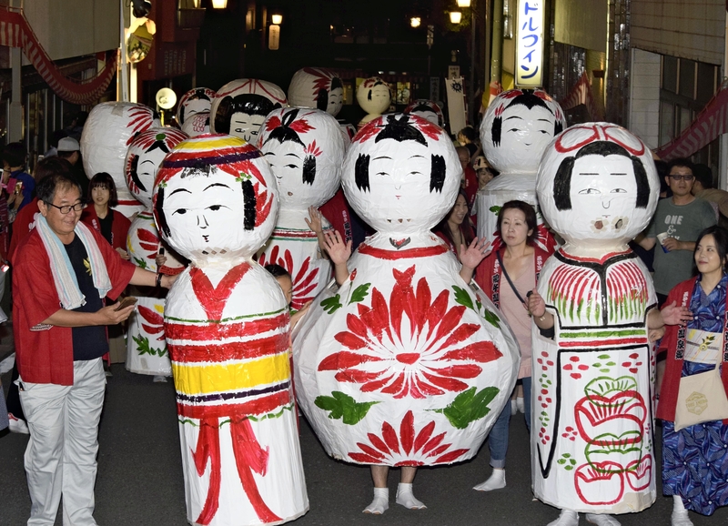 People dressed up as kokeshi traditional dolls parade through the streets of the Naruko Onsen hot spring resort in Osaki, Miyagi Prefecture, on Saturday. The national kokeshi festival was held through Sunday at the resort, which is known for producing the dolls. Local artisans drew the faces and patterns for the 35 kokeshi dolls that marched.