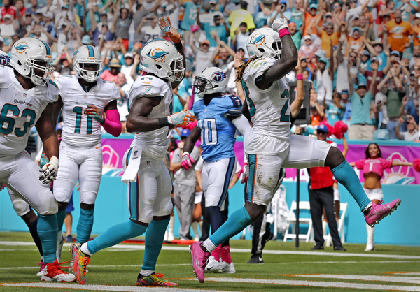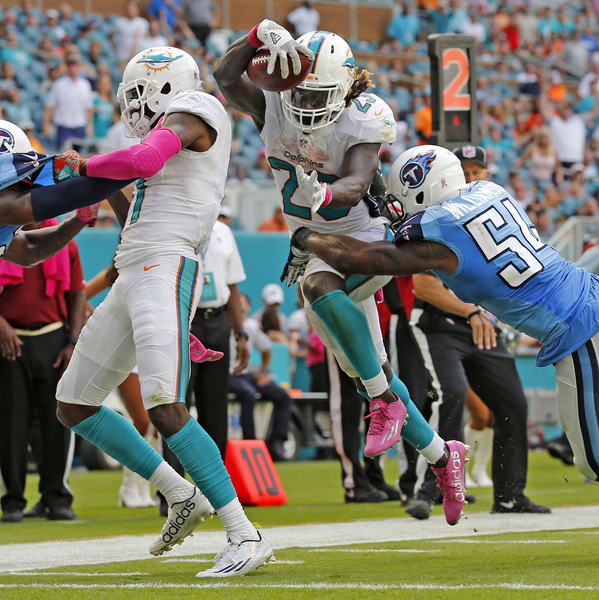 The Dolphins' scored on running back Jay Ajayi's 4-yard run to tie the game at 14 in the second quarter after they tied the score at 7 earlier in the quarter on a 74-yard punt return by wide receiver Jakeem Grant that briefly electrified the crowd at Hard Rock Stadium.
