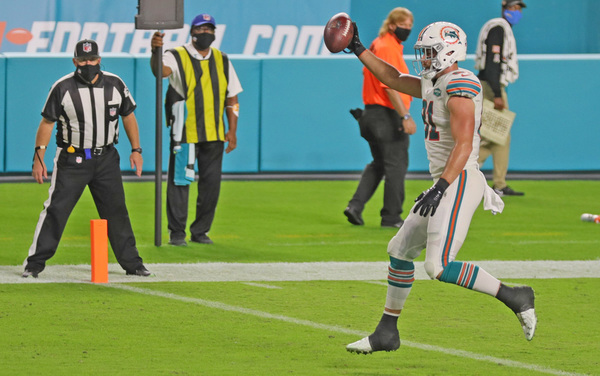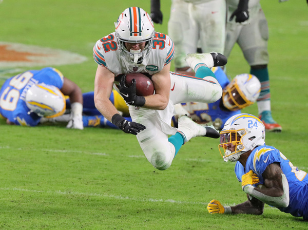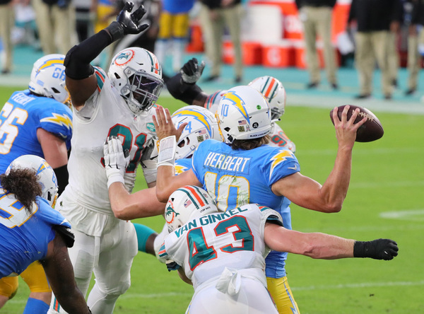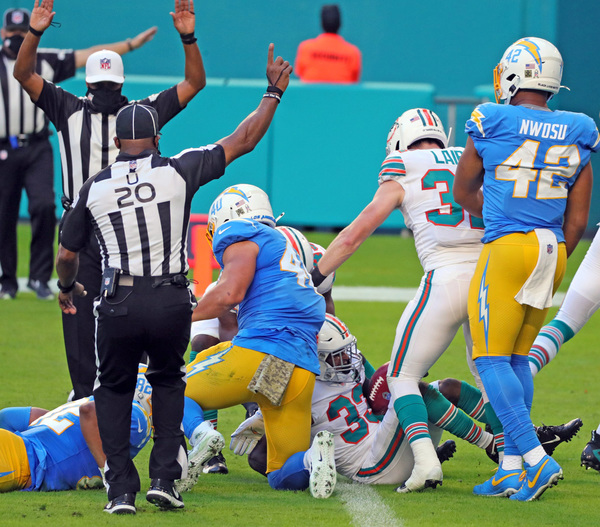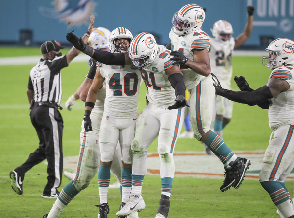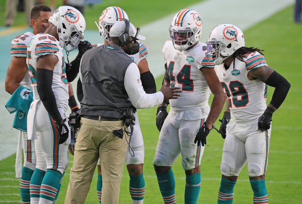 Miami Dolphins head coach Brian Flores talks to players during game against Los Angeles Chargers at Hard Rock Stadium in Miami Gardens on Sunday, November 15, 2020. (Charles Trainor Jr./Miami Herald/TNS)Los Angeles Chargers wide receiver Jalen Guyton (15) on a reception as Miami Dolphins cornerback Xavien Howard (25) defends in the first half at Hard Rock Stadium in Miami Gardens on Sunday, November 15, 2020. (Charles Trainor Jr./Miami Herald/TNS)Miami Dolphins wide receiver Jakeem Grant (19) breaks tackles by Los Angeles Chargers defenders in the second quarter at Hard Rock Stadium in Miami Gardens on Sunday, November 15, 2020. (Charles Trainor Jr./Miami Herald/TNS)Miami Dolphins' Durham Smythe (81) scores a fourth quarter TD against the Los Angeles Chargers at Hard Rock Stadium in Miami Gardens on Sunday, November 15, 2020. (Charles Trainor Jr./Miami Herald/TNS)Miami Dolphins running back Patrick Laird (32) gets tripped up on a run in the second half against the Los Angeles Chargers at Hard Rock Stadium in Miami Gardens on Sunday, November 15, 2020. (Charles Trainor Jr./Miami Herald/TNS)Miami Dolphins wide receiver Jakeem Grant (19) scores on a pass reception from quarterback Tua Tagovailoa (1) in the first quarter at Hard Rock Stadium in Miami Gardens on Sunday, November 15, 2020. (Charles Trainor Jr./Miami Herald/TNS)Miami Dolphins quarterback Tua Tagovailoa (1) scarmbles in the first quarter at Hard Rock Stadium in Miami Gardens on Sunday, November 15, 2020. (Charles Trainor Jr./Miami Herald/TNS)Miami Dolphins defensive end Emmanuel Ogbah (91) celebrates a defensive play against the Los Angeles Chargers at Hard Rock Stadium in Miami Gardens on Sunday, November 15, 2020. (Charles Trainor Jr./Miami Herald/TNS)Los Angeles Chargers quarterback Justin Herbert (10) attempts to pass under pressure by the Miami Dolphins defense in the second quarter at Hard Rock Stadium in Miami Gardens on Sunday, November 15, 2020. (Charles Trainor Jr./Miami Herald/TNS)Los Angeles Chargers outside linebacker Nick Vigil (59) picks up a fumble on a bad snap to Miami Dolphins quarterback Tua Tagovailoa (1) in the second quarter at Hard Rock Stadium in Miami Gardens on Sunday, November 15, 2020. (Charles Trainor Jr./Miami Herald/TNS)