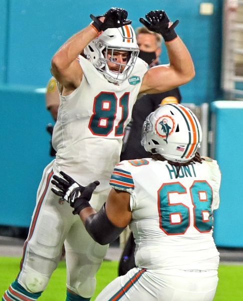 Miami Dolphins' Durham Smythe (81) and offensive tackle Robert Hunt (68) celebrate Smythe's fourth quarter TD against the Los Angeles Chargers at Hard Rock Stadium in Miami Gardens on Sunday, November 15, 2020. (Charles Trainor Jr./Miami Herald/TNS)