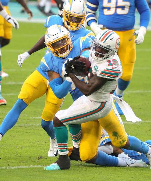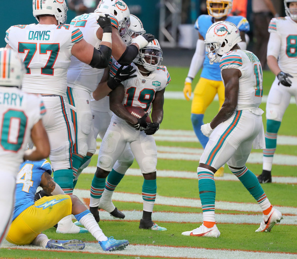 Miami Dolphins wide receiver Jakeem Grant (19) on a pass reception from quarterback Tua Tagovailoa (1) against the Los Angeles Chargers in the first quarter at Hard Rock Stadium in Miami Gardens on Sunday, November 15, 2020. (Charles Trainor Jr./Miami Herald/TNS)