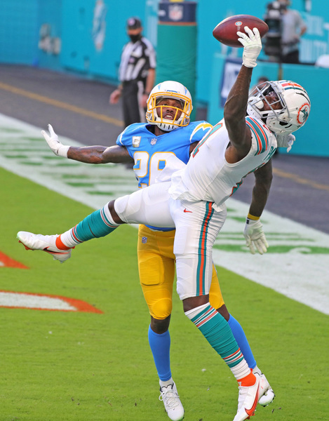 Miami Dolphins wide receiver DeVante Parker (11) is ruled out of bounds in the end zone in the first half against the Los Angeles Chargers at Hard Rock Stadium in Miami Gardens on Sunday, November 15, 2020. (Charles Trainor Jr./Miami Herald/TNS)