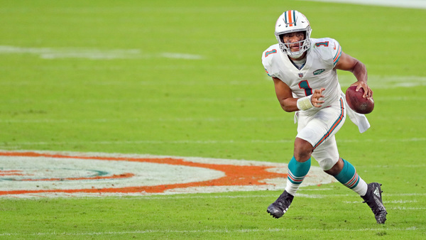 Miami Dolphins quarterback Tua Tagovailoa (1) on the run in the first quarter at Hard Rock Stadium in Miami Gardens on Sunday, November 15, 2020. (Charles Trainor Jr./Miami Herald/TNS)