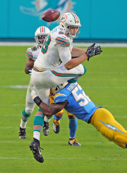 Incomplete pass intended for Miami Dolphins tight end Mike Gesicki (88) as Los Angeles Chargers middle linebacker Denzel Perryman (52) defends in the first half at Hard Rock Stadium in Miami Gardens on Sunday, November 15, 2020. (Charles Trainor Jr./Miami Herald/TNS)