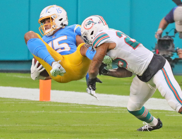 On third-and-12 from Los Angeles' 45, with the Dolphins up six and the fourth quarter just begun, Herbert through an out-route to Mike Williams.