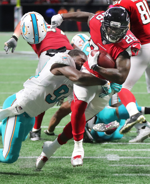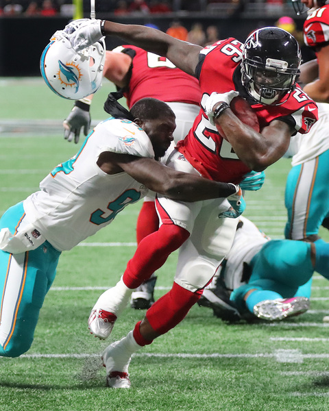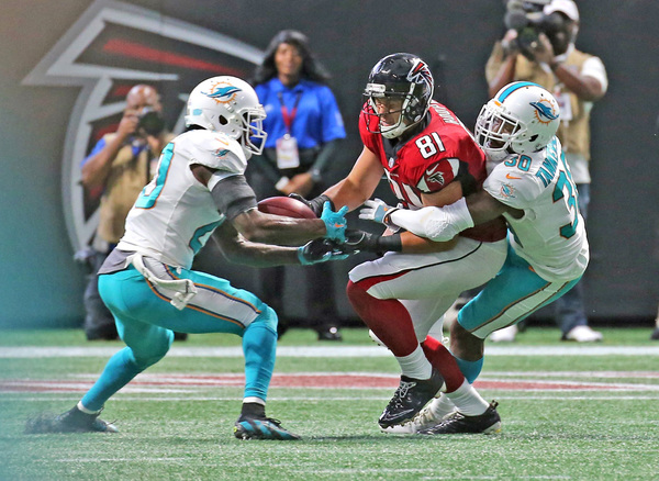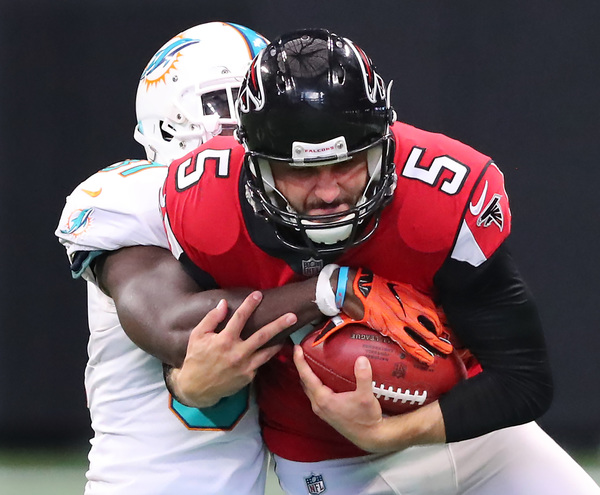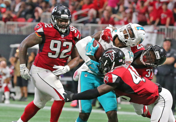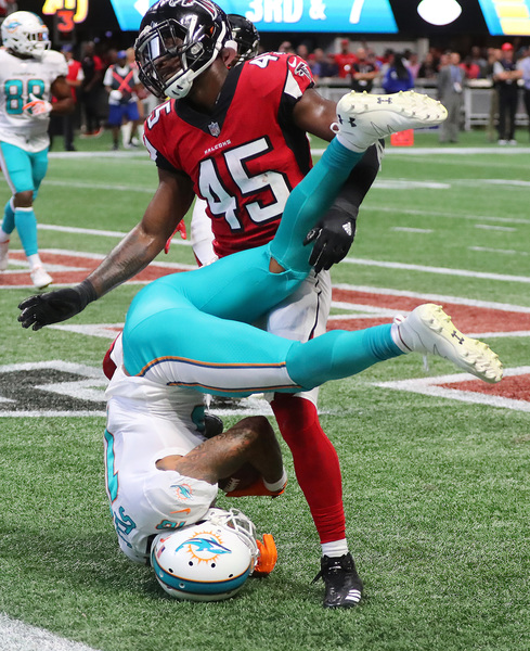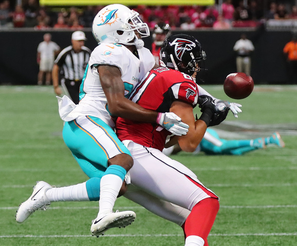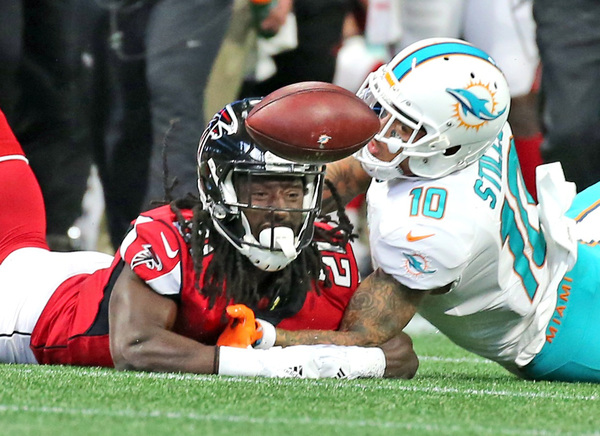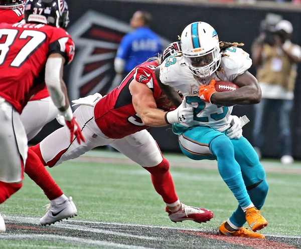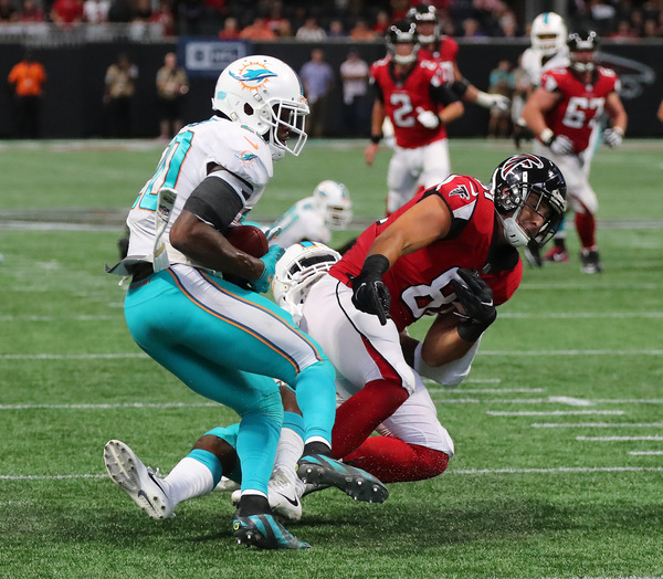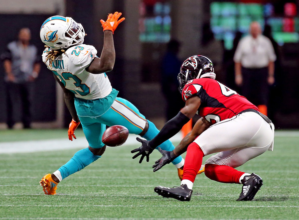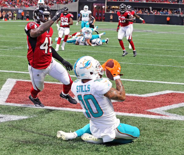After a Falcons three and out and a poor punt, the Dolphins gained possession on their own 49 and were greatly aided by two Falcons penalties: a 26-yard pass interference penalty on a deep ball to Jakeem Grant (who was double covered) and a late hit on Cutler (negating what would have been Deion Jones' second interception).