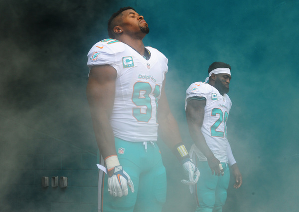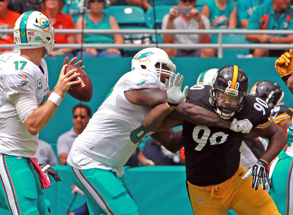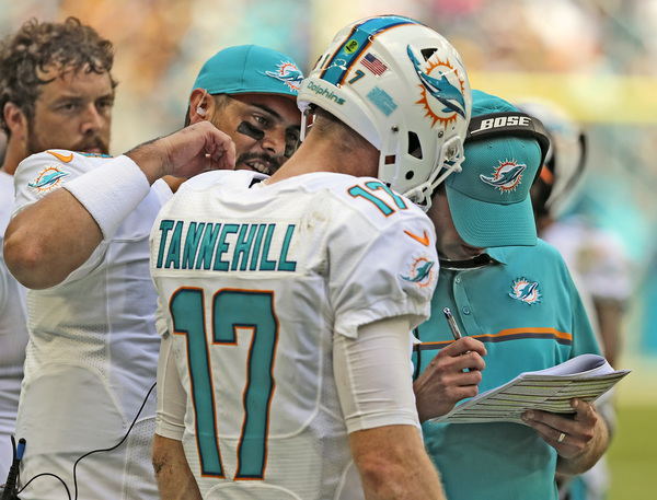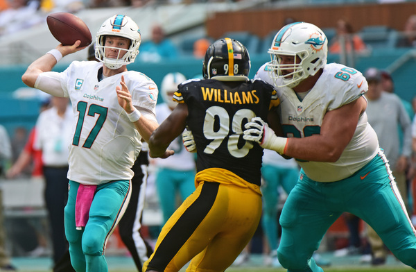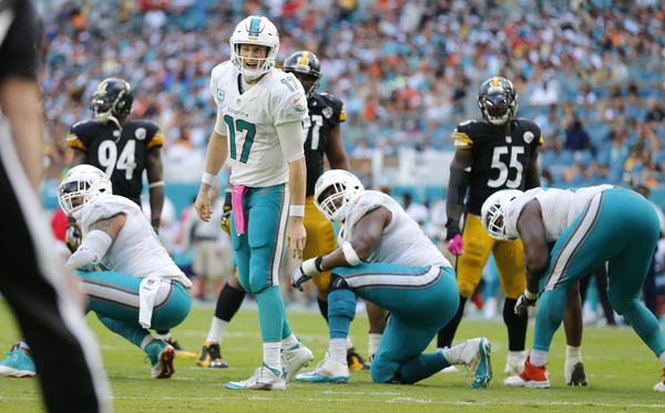 The Dolphins' offensive line of center Mike Pouncey, left guard Laremy Tunsil, left tackle Branden Albert, right guard Jermon Bushrod and right tackle Ja'Wuan James played together for the first time all year and kept quarterback Tannehill from getting sacked, a rare feat.