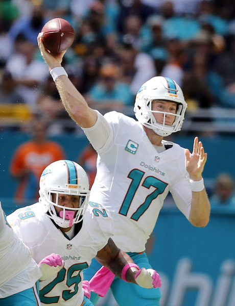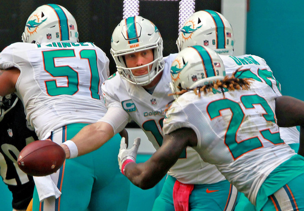 The Dolphins (2-4) rushed for a season-high 222 yards, led by running back Jay Ajayi's career-best 204-yard effort. Quarterback Ryan Tannehill (24 of 32, 252 yards, no touchdowns, no interceptions, 97.4 passer rating) was good, and wide receiver Jarvis Landry (seven receptions, 91 yards) was solid.