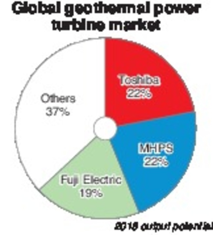 According to the Japan Geothermal Association (JGA), the three companies have a global share of more than 60 percent in the market for geothermal power turbines, which make up the core of geothermal power plants.