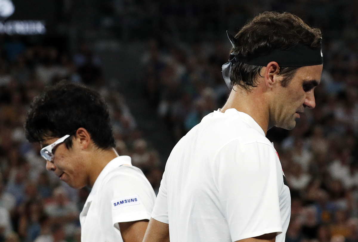 Chung won one more game but after Federer held for 5-2 he walked to the net to offer his hand, departing the arena to sympathetic applause and a smattering of boos.