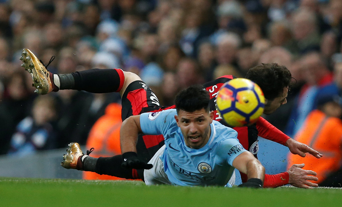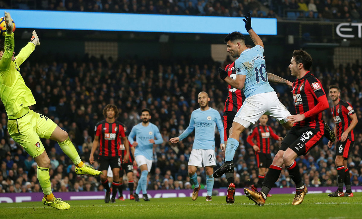 Soccer Football - Premier League - Manchester City vs AFC Bournemouth - Etihad Stadium, Manchester, Britain - December 23, 2017 Manchester City's Sergio Aguero scores their third goal REUTERS/Andrew Yates