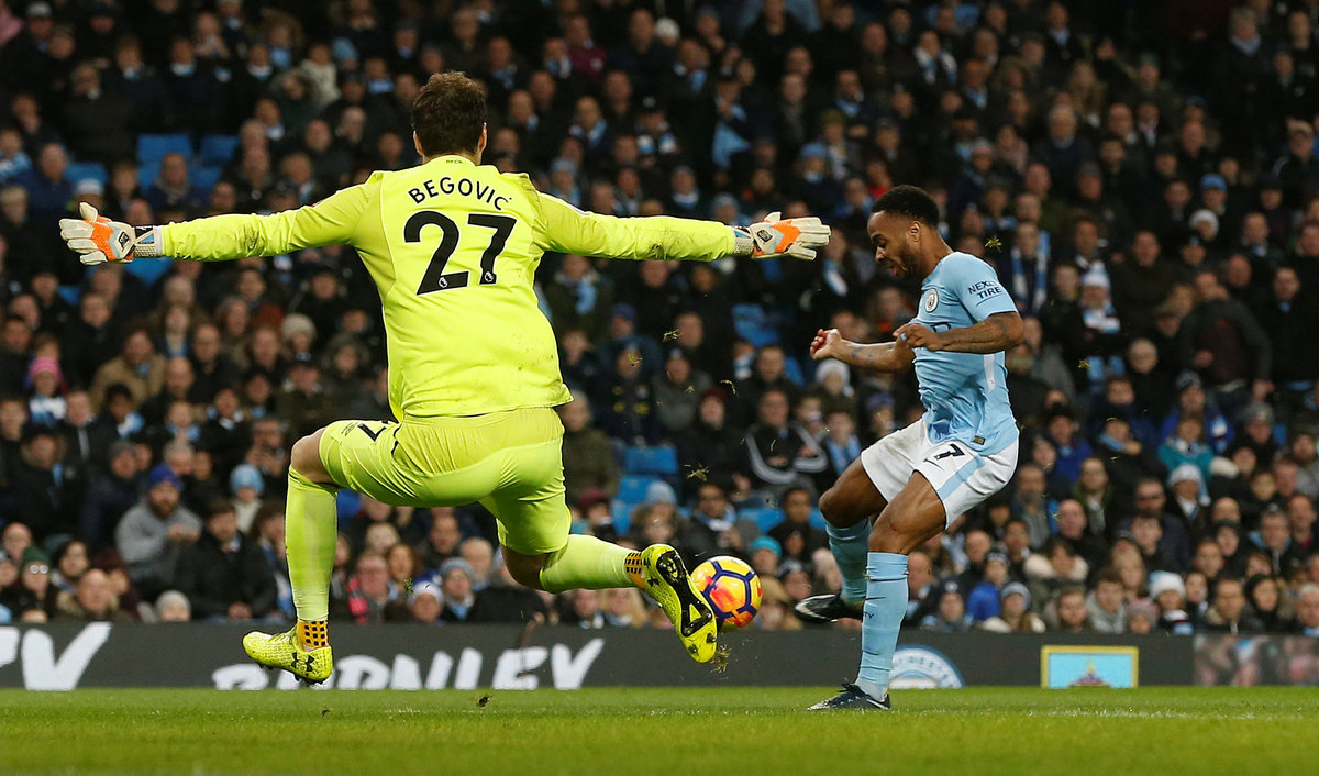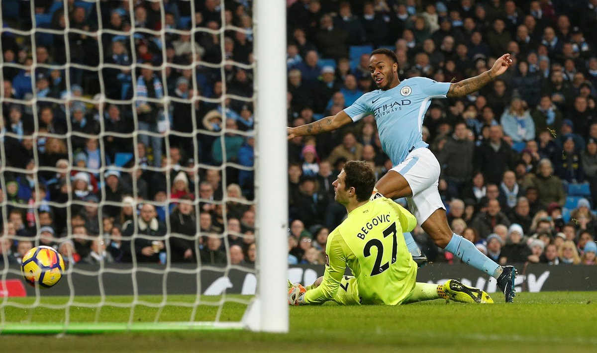 Soccer Football - Premier League - Manchester City vs AFC Bournemouth - Etihad Stadium, Manchester, Britain - December 23, 2017 Manchester City's Raheem Sterling scores their second goal past Bournemouth's Asmir Begovic REUTERS/Andrew Yates